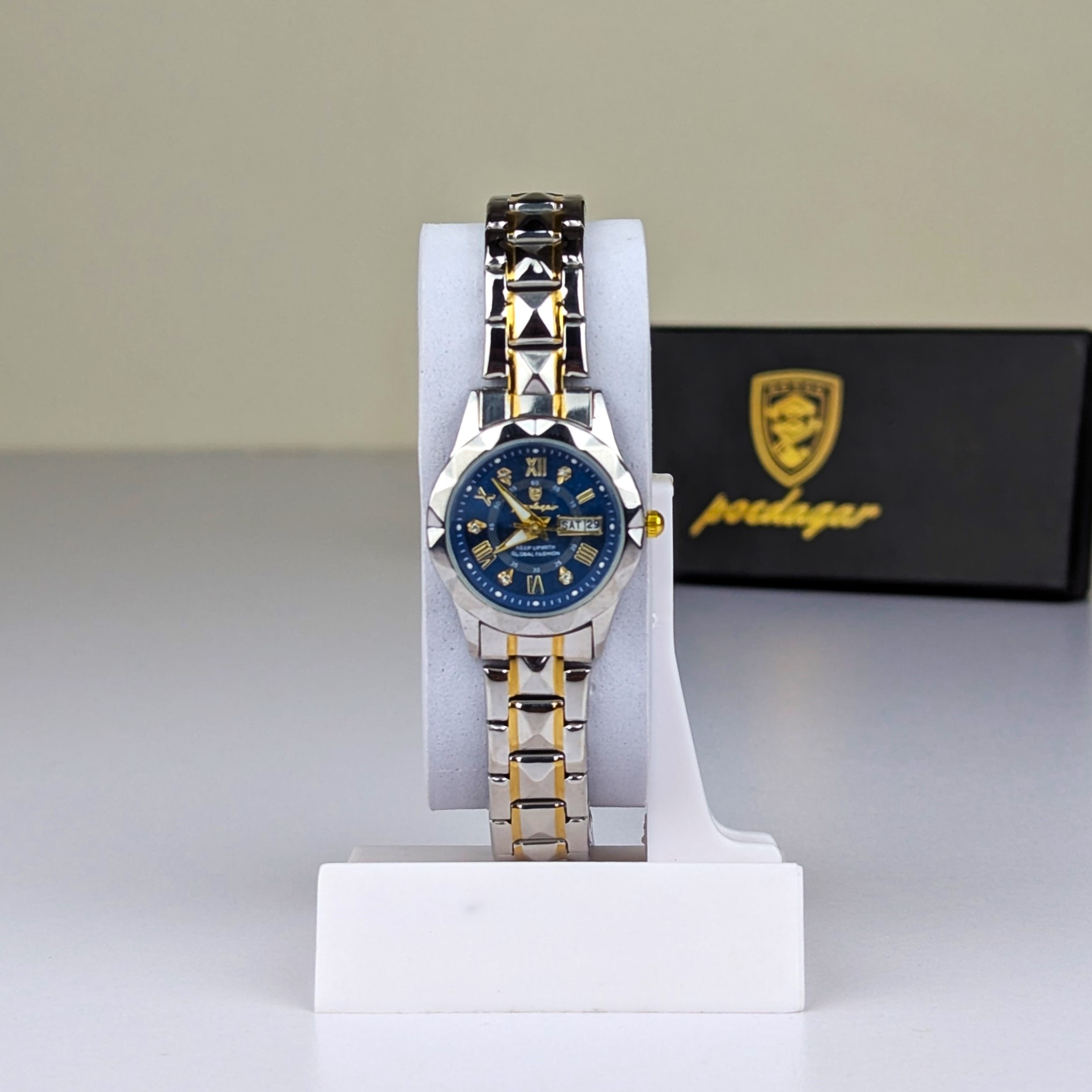 ডায়ালে রোমান সংখ্যা এবং পাথরের কাজ দেওয়া আছে, যা ঘড়িটিকে লাক্সারি লুক দেয়।